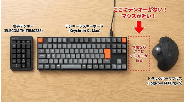 右側にテンキーがあると、数字を打つたびに**「マウスから手を離す → 数字を打つ → マウスを持ち直す」**という動作の分断(ムダ)が発生します。しかし、テンキーを左側に配置すれば、驚くほど効率が変わります。