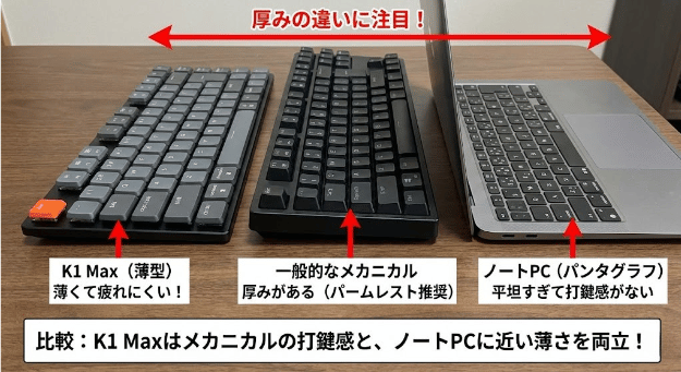 正直に言うと、K1 Maxは薄型(ロープロファイル)とはいえ、ノートPCのようなパンタグラフ式キーボードに比べればそれなりの厚みがあります。初めて触る方は「意外と高さがあるな」と感じるかもしれません。
