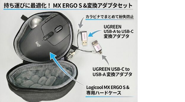 MX ERGO Sの持ち運びにおける「紛失・破損リスク」は、『WERJIA 収納ケース』と『UGREEN USB変換アダプタ』を組み合わせることで完全に解決できます。